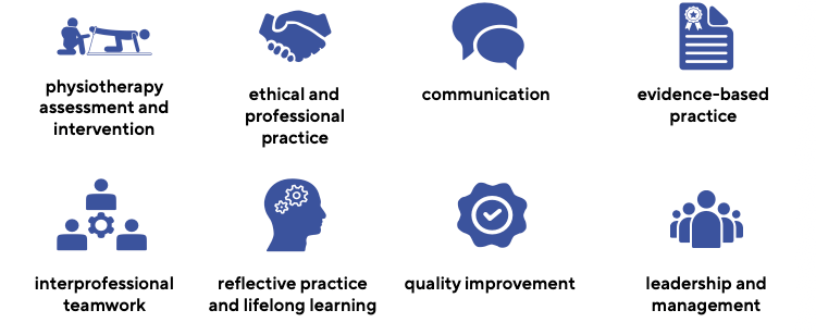 The World Physiotherapy framework organises physiotherapist competence into eight distinct domains, each representing a core area of professional practice: