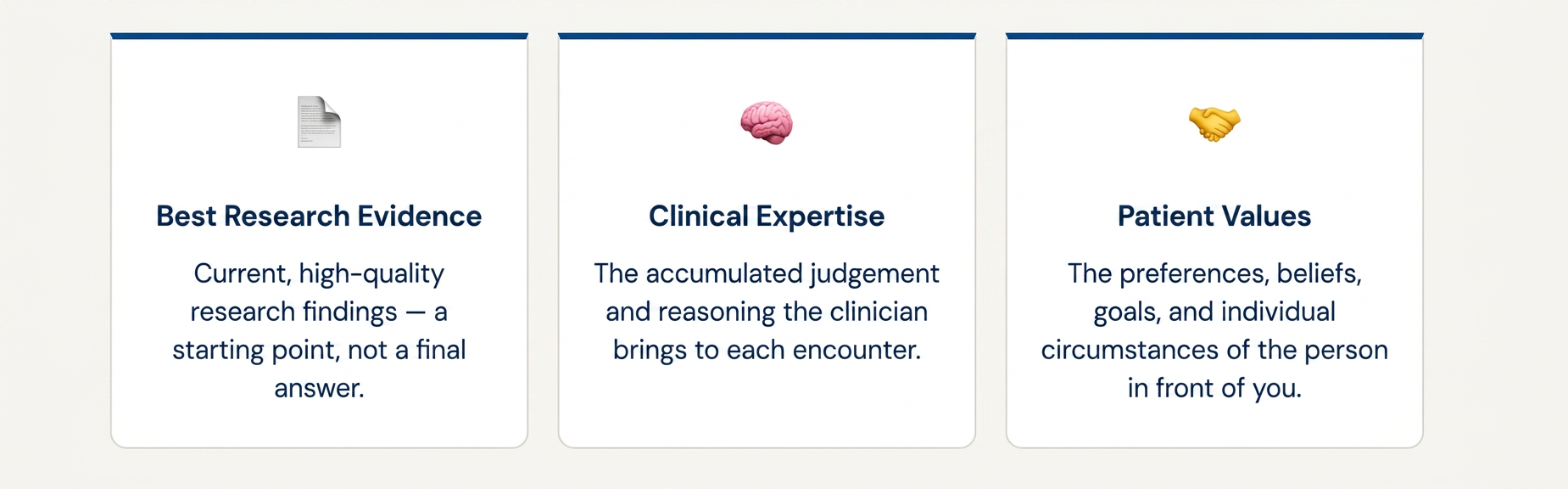 Real evidence-based practice, as Sackett defined it nearly thirty years ago, is not just about finding a good study. It is about integrating three things simultaneously