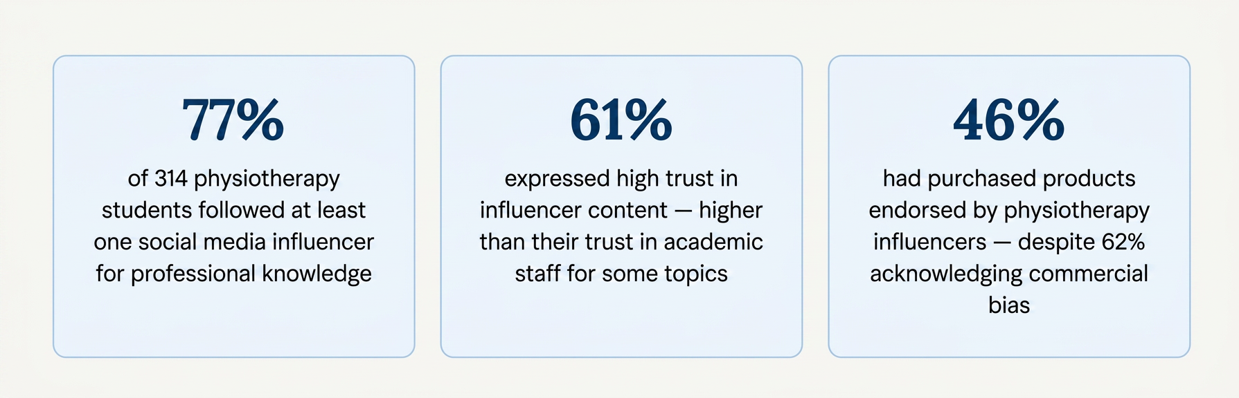 THE CORE PROBLEM: Trust in social media influencers is built through repeated exposure and perceived informativeness, not through evidence quality. A student who follows five physiotherapy influencers is significantly more likely to trust their content than one who has completed critical appraisal training. The platform builds the trust that the curriculum cannot undo.